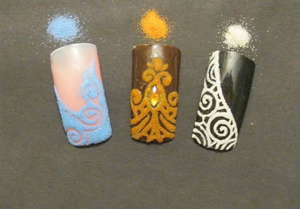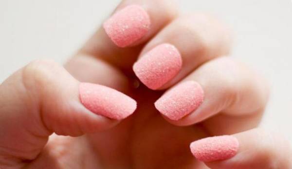 - Песок, нанесенный на ногти, по всем правилам, не отклеится и будет долго сохранять целостность рисунка.