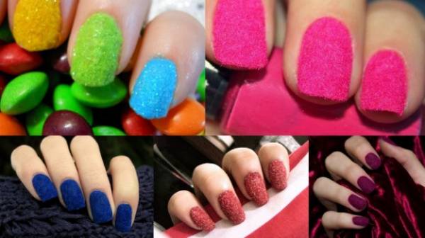 Ярых противниц гелей для ногтей, считающих, что они портят ногтевую структуру, обрадует лак для ногтей, который носит название «песочный». Он идеально подойдет для создания «сахарного маникюра», так как в его составе содержатся мелкие силиконовые частички различного размера. За счет них создается «эффект песка» на поверхности ногтя. Часто в составе присутствуют блестки, делающие маникюр праздничным и сияющим.