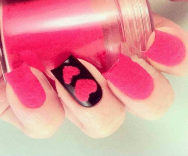 Оформление с помощью бархатного песка еще один способ сделать оригинальный маникюр, которым можно удивить окружающих и похвастаться перед подругами. Процесс выполнения прост, а результат, действительно, великолепен. Для большей неповторимости можно применить технику «жидких камней» в сочетании с бархатной пудрой.