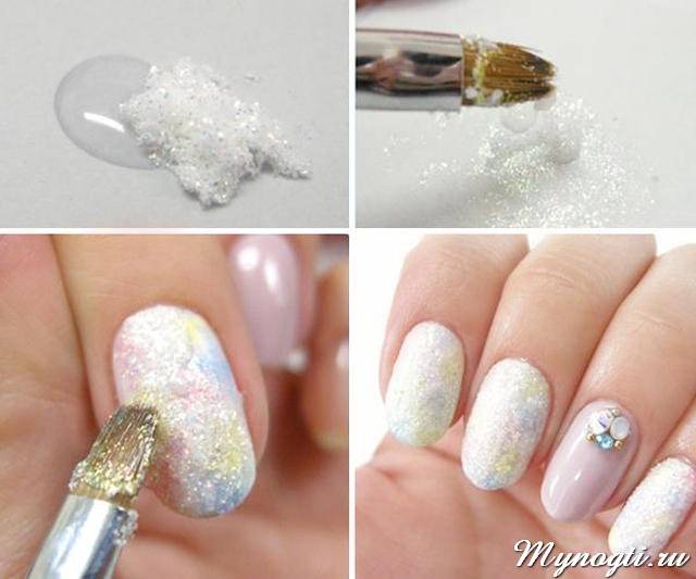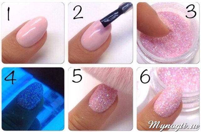 Красивый маникюр с оригинальной текстурой можно создать в условиях дома. Для чего понадобятся лак или гелевый аналог, базовое и топовое покрытие и порошкообразные блестки. Процесс оформления ногтей следующий: На ногти наносят базовое и цветное покрытие, покрывают топом а с помощью лопаточки сразу же присыпают ногти порошком. Как вариант, можно даже окунуть ногти в емкость с блестками для более насыщенного покрытия. Излишки стряхнуть.