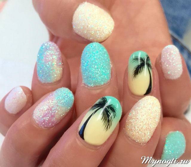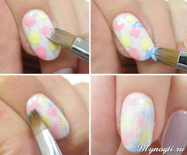 В этом случае флок аккуратно наносят с помощью кисточки. При этом возле корня наносится один цвет, а затем по мере приближения к кончику добавляются другие, схожие по цветовой гамме. Это самые простые способы использования радужного песка, для которых не нужны профессиональные навыки.
