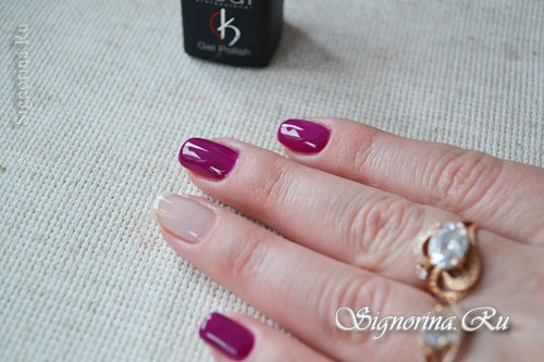 5) Для безымянного пальца смешиваем капельку базы с капелькой гель-лака основного цвета, смешиваем между собой и наносим тонким слоем на поверхность ногтя.