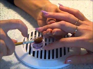 На еще не высохшую ногтевую поверхность надо насыпать много пудры, высушить и стряхнуть кисточкой остатки.