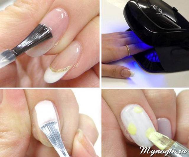 - на заранее подготовленную ногтевую пластину наносится гель либо лак;
