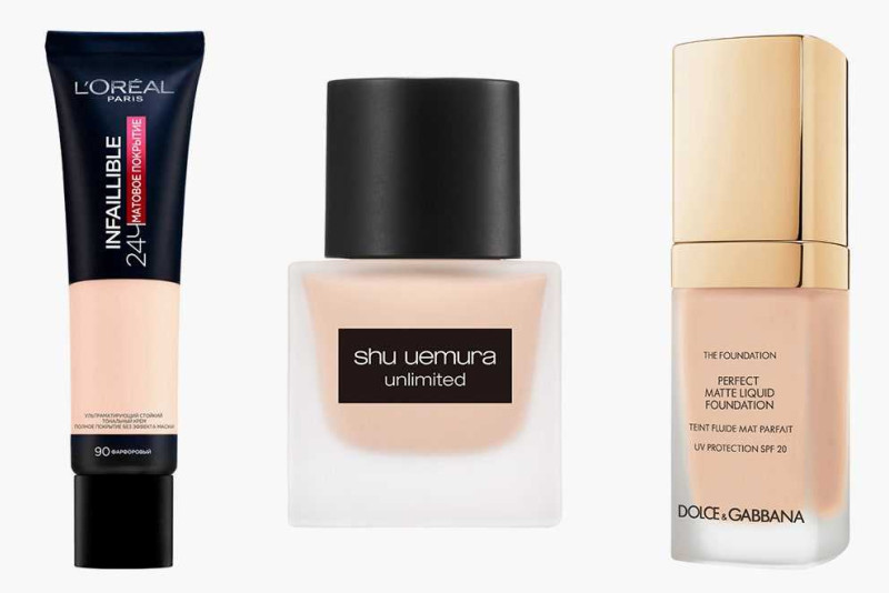 Выбор редактора: Ультраматирующий тональный крем, L’Oreal Paris, 598 рублей; тональный флюид, Shu Uemura, 3550 рублей; матирующее тональное средство-флюид, Dolce & Gabbana, 4940 рублей