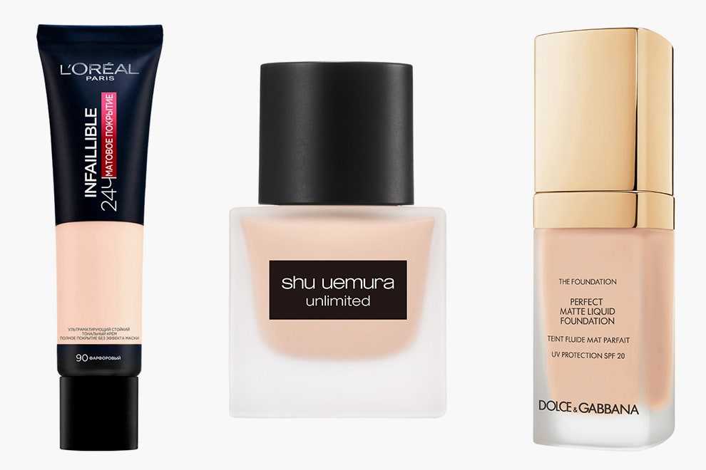 Выбор редактора: Ультраматирующий тональный крем, L’Oreal Paris, 598 рублей; тональный флюид, Shu Uemura, 3550 рублей; матирующее тональное средство-флюид, Dolce & Gabbana, 4940 рублей
