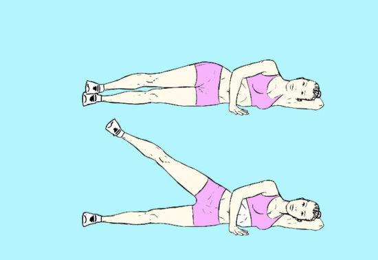 Для этого упражнения понадобится коврик. Нужно лечь на правый бок, вытянув обе ноги. Тело должно образовывать прямую линию. Руки можно положить на пол. Медленно поднимите левую ногу вверх, натянув носок.