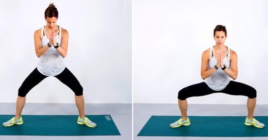 Встаньте так, чтобы расстояние между вашими ногами было шире плеч. Носочки и колени должны быть направлены наружу. Руки можно положить на пояс или вытянуть вперед для сохранения равновесия. Медленно опустите таз вниз. Угол в колене – 90 градусов. При идеальной технике бедра должны образовывать прямую линию. Подниматься можно быстро, но выпрямлять ноги полностью нежелательно. Это может привести к появлению болей в коленных суставах.