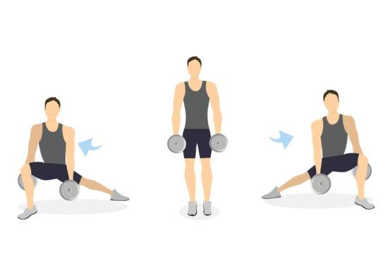 Они отлично задействуют ягодичные мышцы и внутреннюю поверхность бедра. Исходное положение – ноги на ширине плеч, руки с гантелями вдоль тела. Сделайте широкий шаг в сторону и переместите свой вес на опорную ногу. Руки при этом должны смещаться немного вперед. Опуститесь до того момента, когда угол в коленном суставе опорной ноги будет прямым. Немного задержитесь в нижней точке и примите исходное положение.