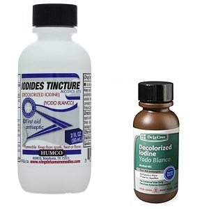 Обесцвеченный (белый) йод считается очень эффективным средством на западе для укрепления и лечения ногтей (включая пятна на них). Кроме этого он имеет много других применений, включая улучшение состояния волос, и не оставляет пятен на коже. Представляет собой это средство спиртовой раствор иодида калия и иодида аммония. Его следует наносить дважды в день, местно на пораженные участки, для достижения результатов.