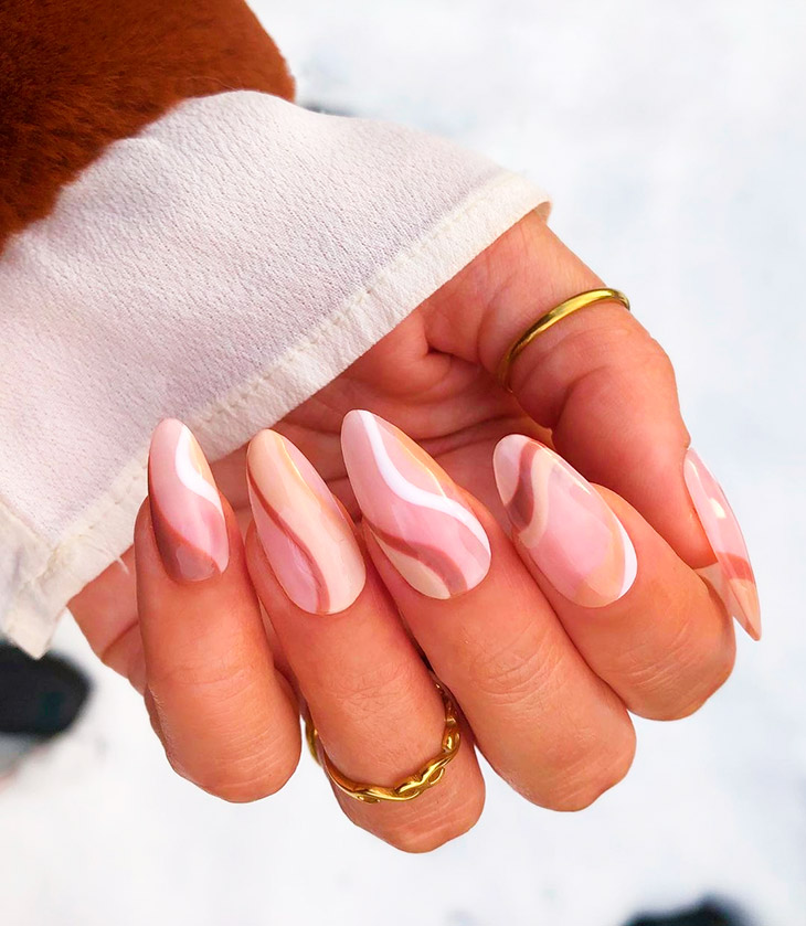 Овальные ноготочки — хит в этом году. Для них подойдет любой дизайн. Выигрышно смотрятся плавные продольные линии. Если хотите подчеркнуть женственность, то отдайте предпочтение рисункам цветов. Такие мотивы подчеркнут изящность.