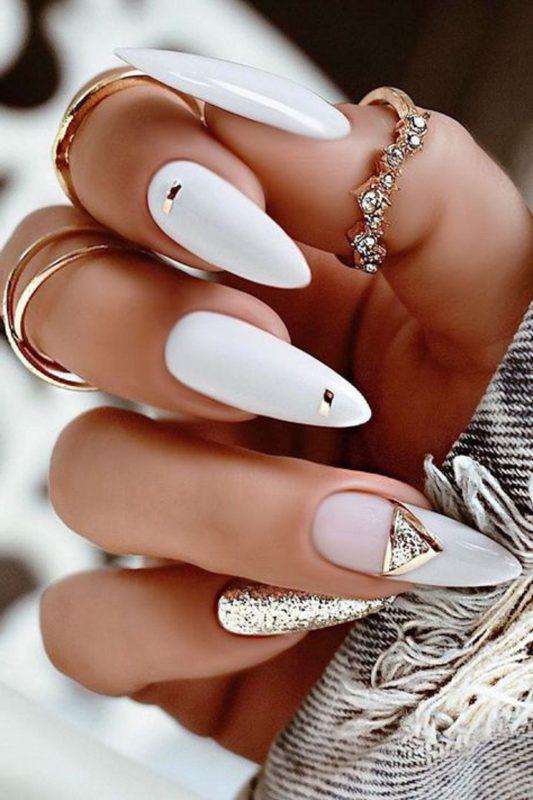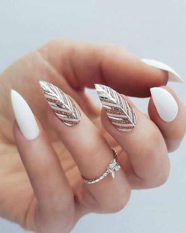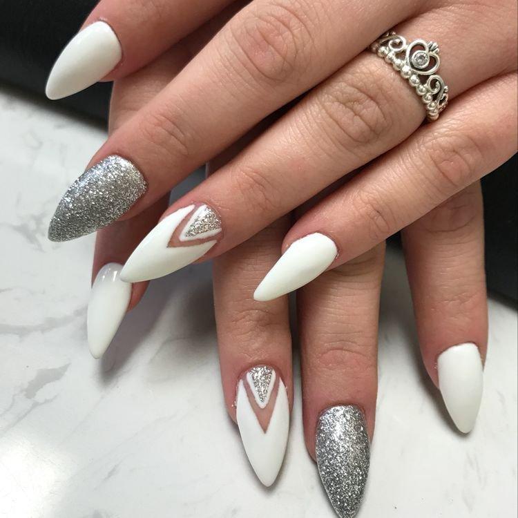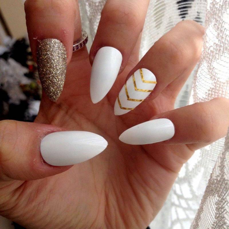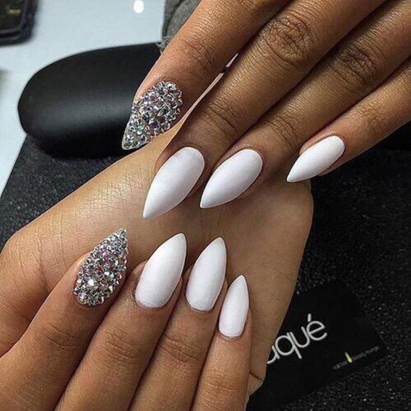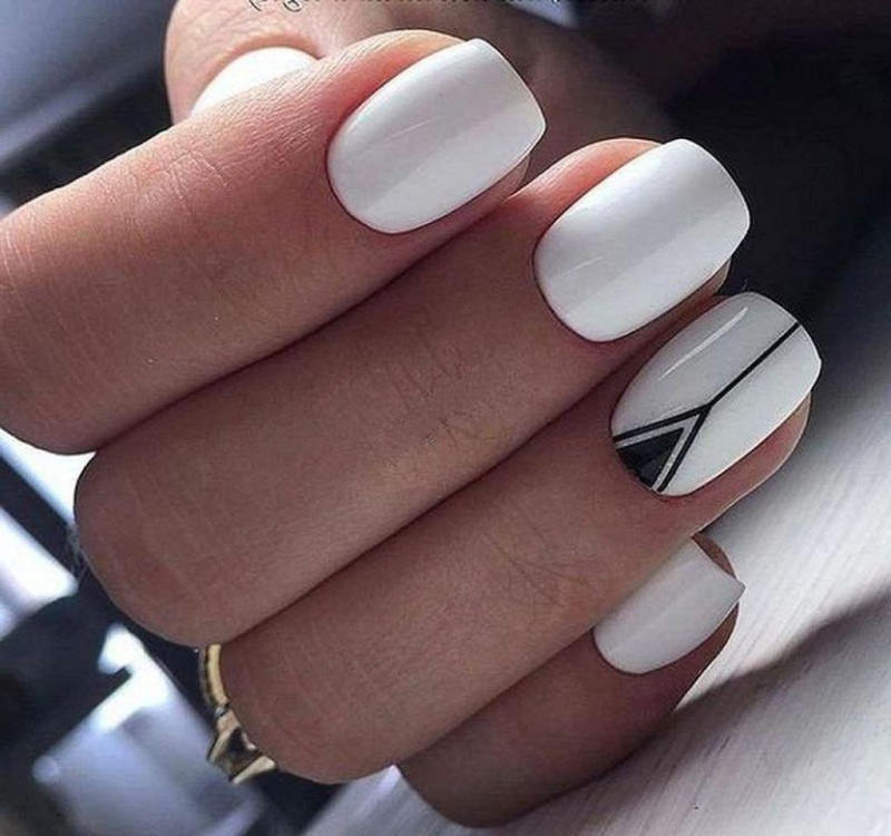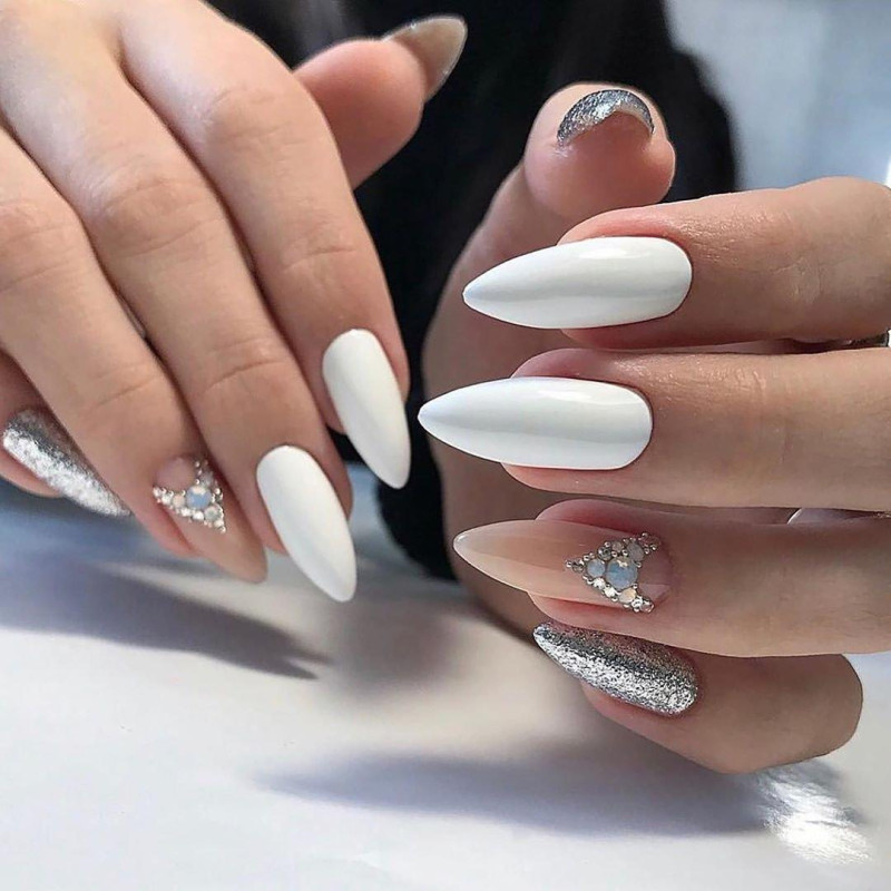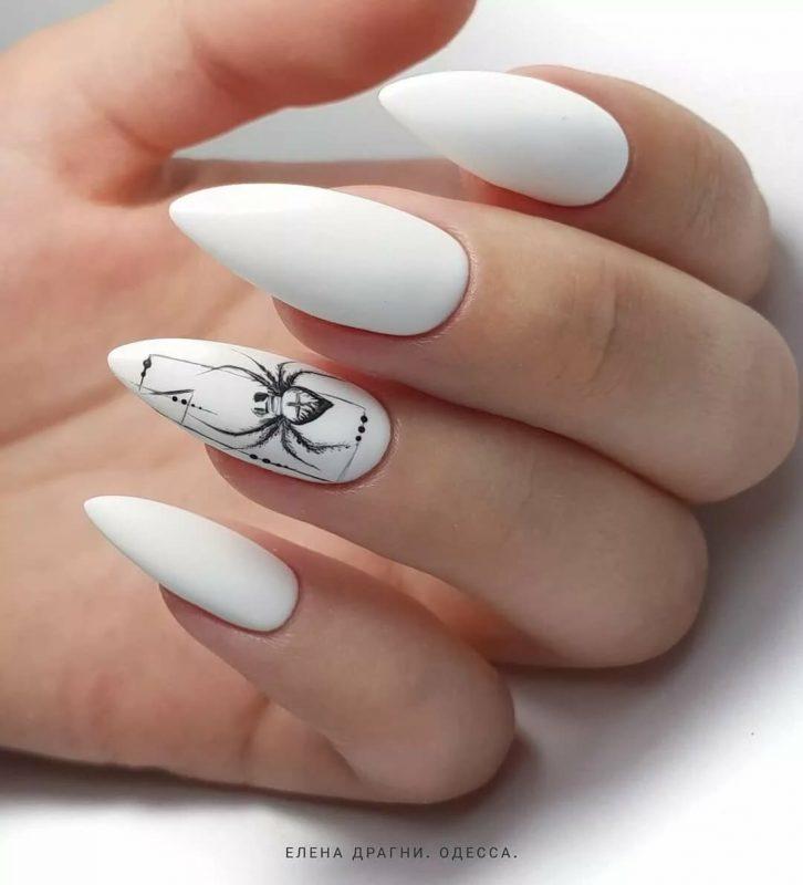 В списке новинок оказались острые белые ногти. Это дизайн, который придаст вашему образу совершенно новый вид, отличный вариант для девушек, которые хотят показать свою сексуальность. Маникюр смотрится ярко, свежо и нежно одновременно. Актуально будет покрыть все ногти белым лаком, а на безымянный палец нанести серебристые блестки. Также прекрасно будут смотреться геометрия и абстракция.