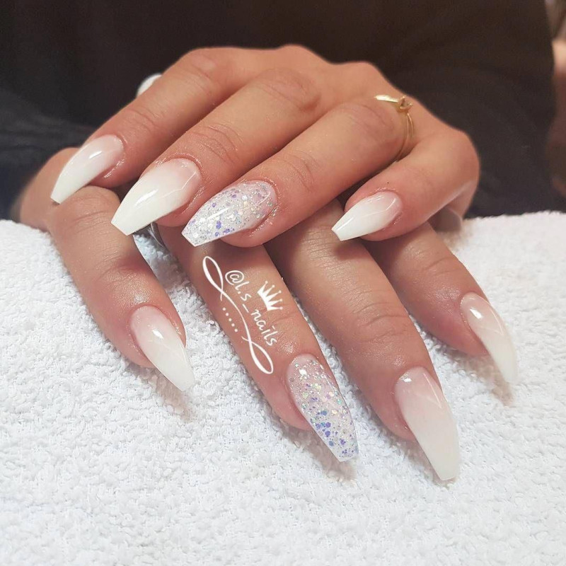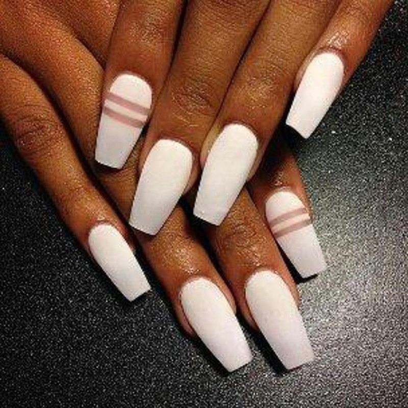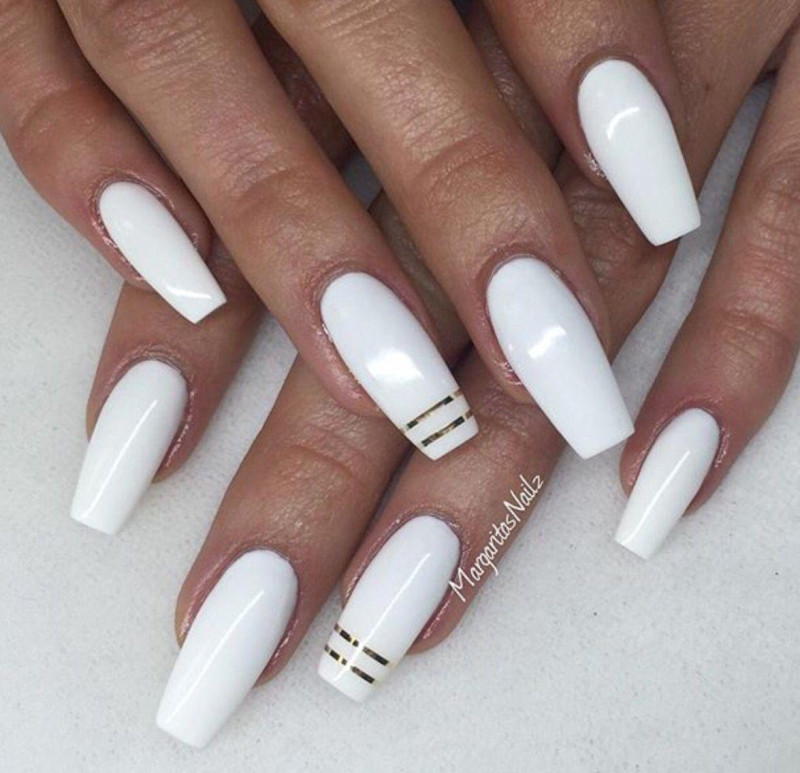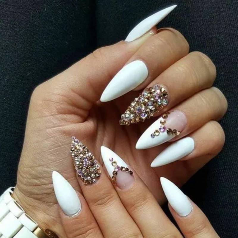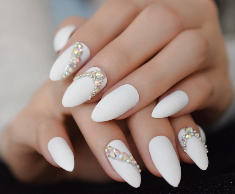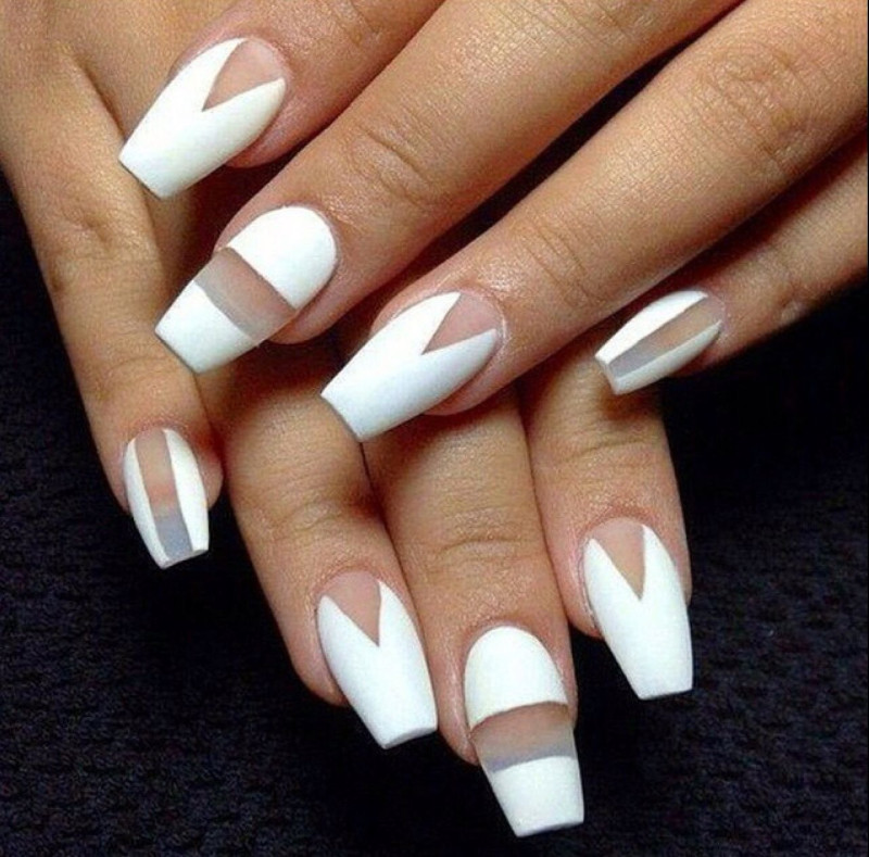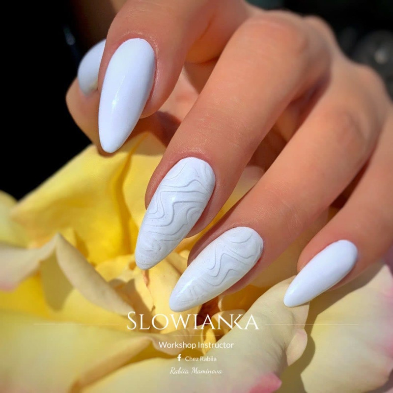 В списке новинок оказались острые белые ногти. Это дизайн, который придаст вашему образу совершенно новый вид, отличный вариант для девушек, которые хотят показать свою сексуальность. Маникюр смотрится ярко, свежо и нежно одновременно. Актуально будет покрыть все ногти белым лаком, а на безымянный палец нанести серебристые блестки. Также прекрасно будут смотреться геометрия и абстракция.