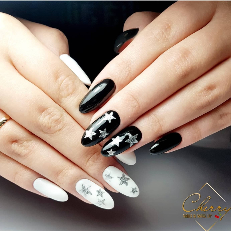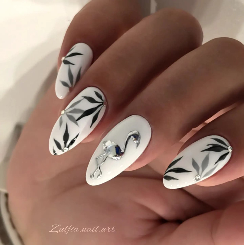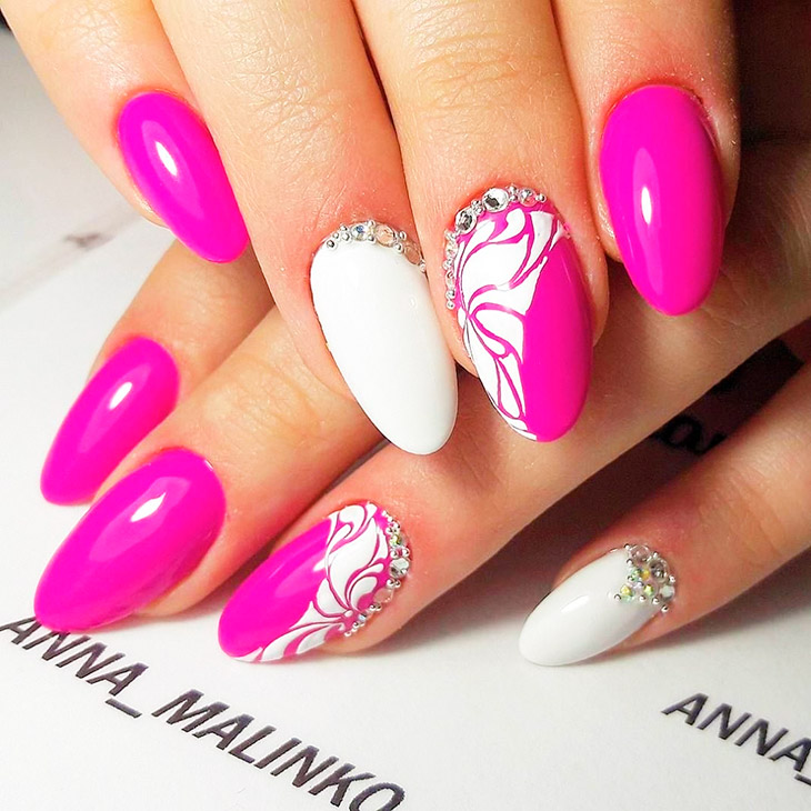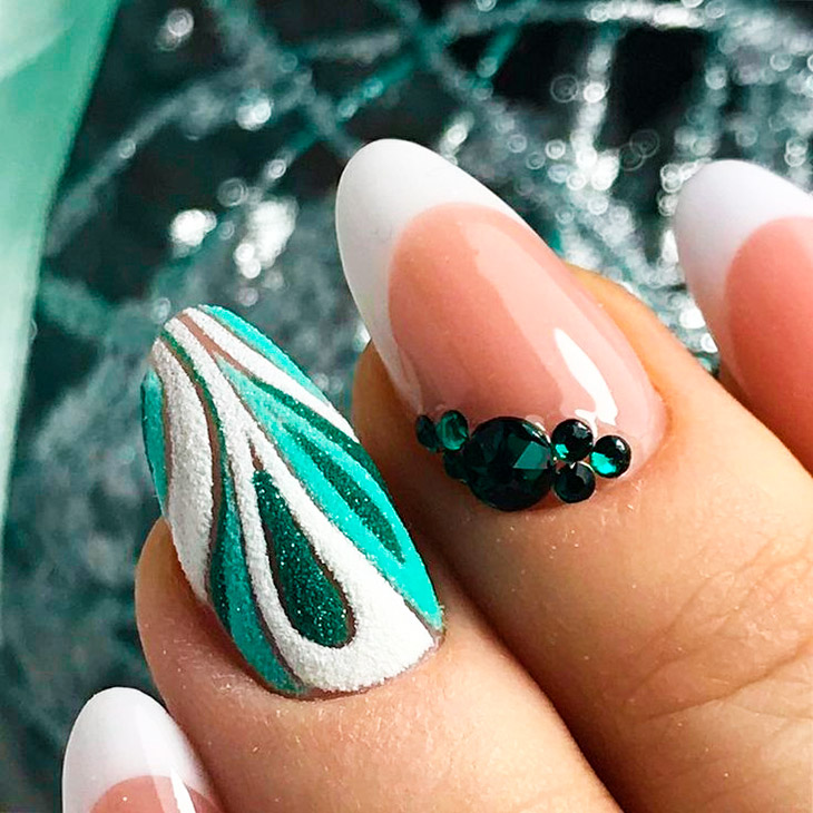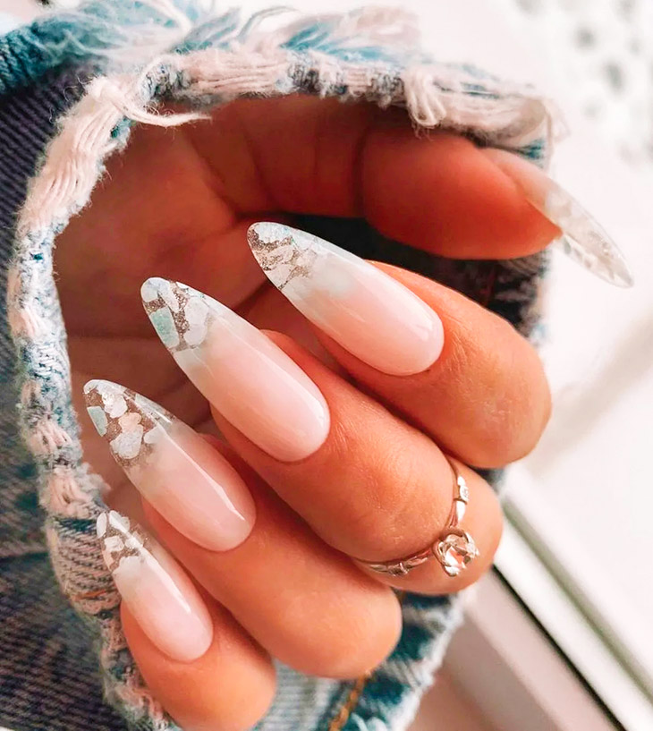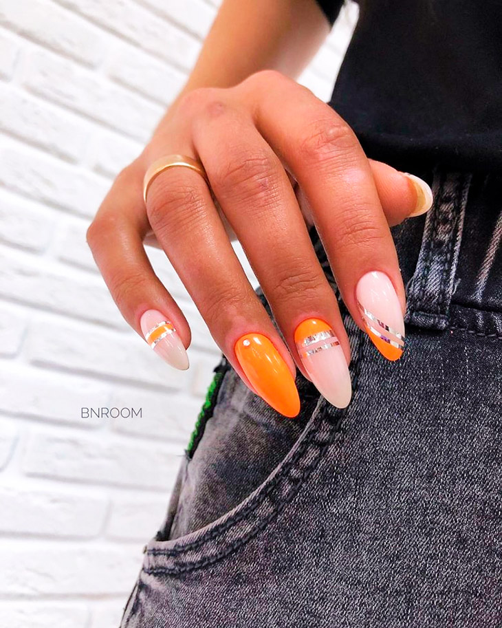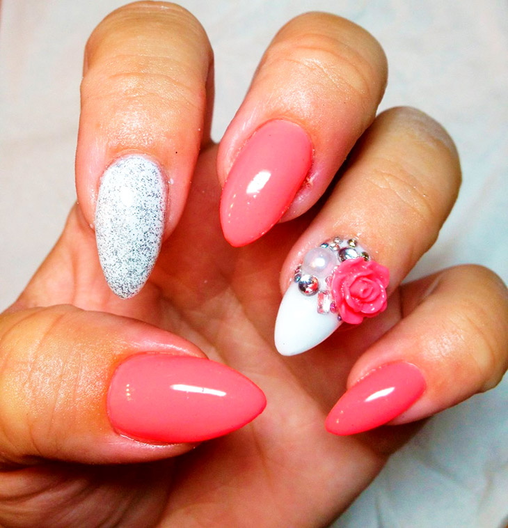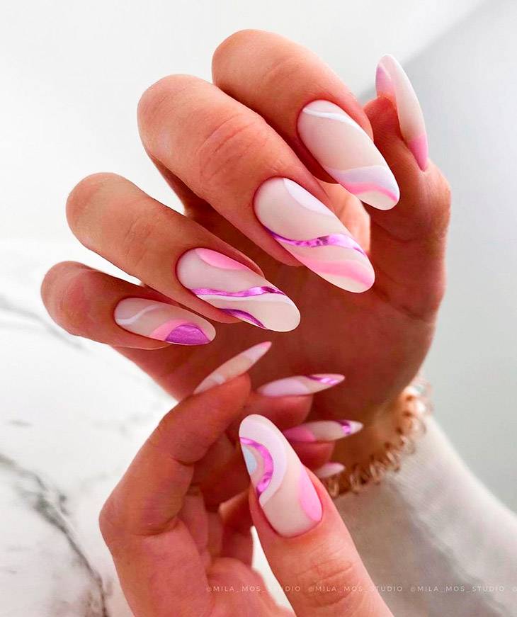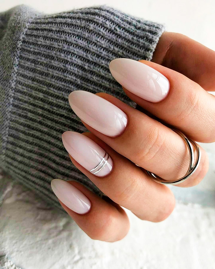 Для миндалевидных ногтей идеальны следующие элементы декора: камушки, фольга, пайетки, полосочки, рисунки. На миндалевидных ноготочках они выглядят элегантно и нежно.