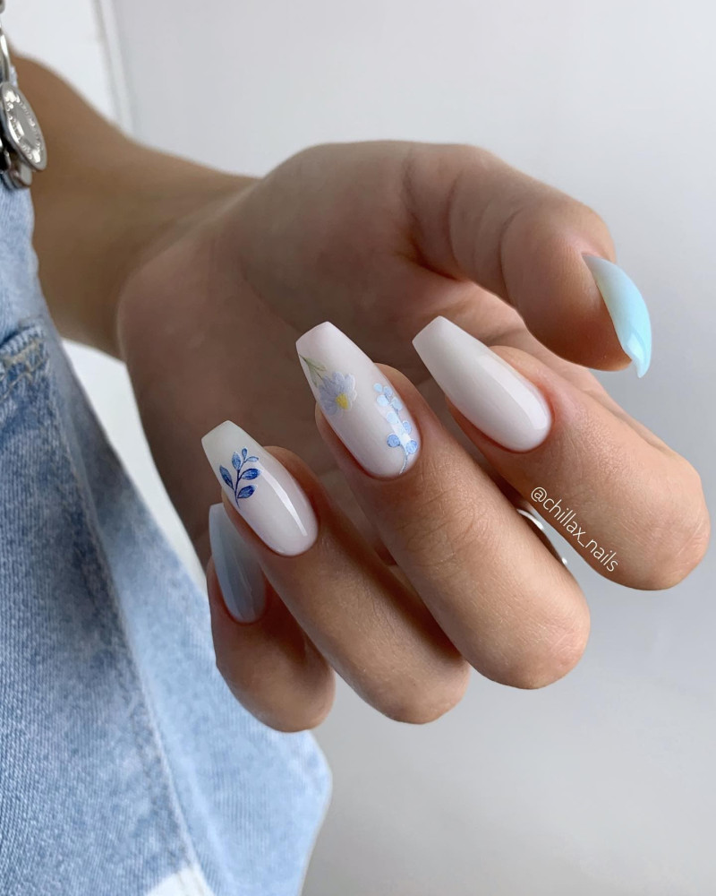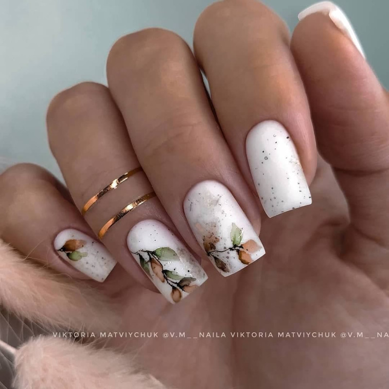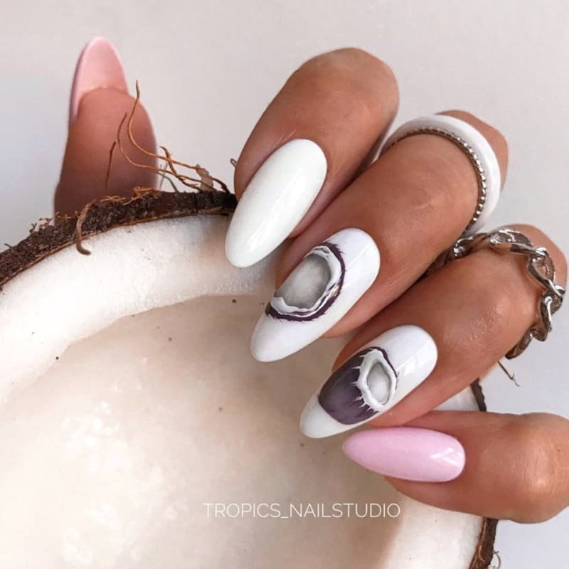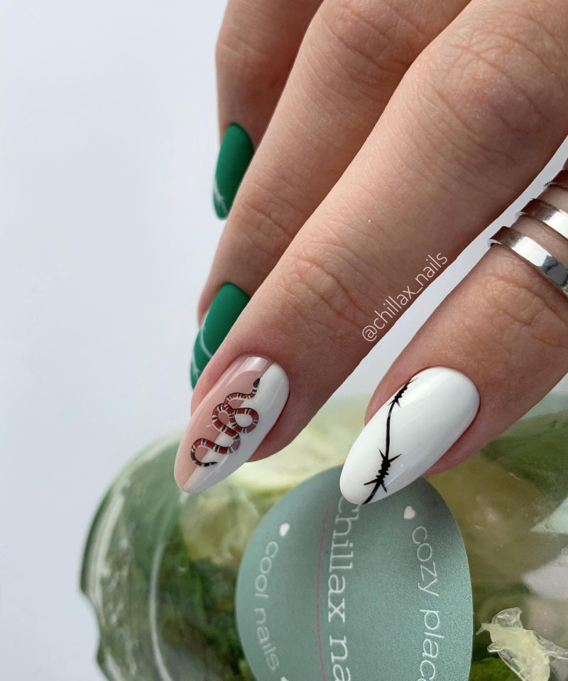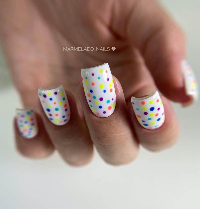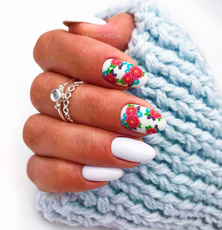 В тренде разноцветный маникюр, когда отдельные пальцы окрашивают белым лаком, а остальные — другими цветами. Дополняют композицию декором, росписью. Вариантов подобного маникюра множество, все зависит от концепции дизайна.