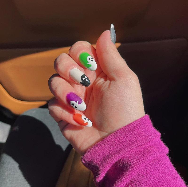 Молодому поколению нравится разноцветное оформление ногтей. Для оригинальности в качестве декора используют наклейки, буквы, рисунки типа смайликов.