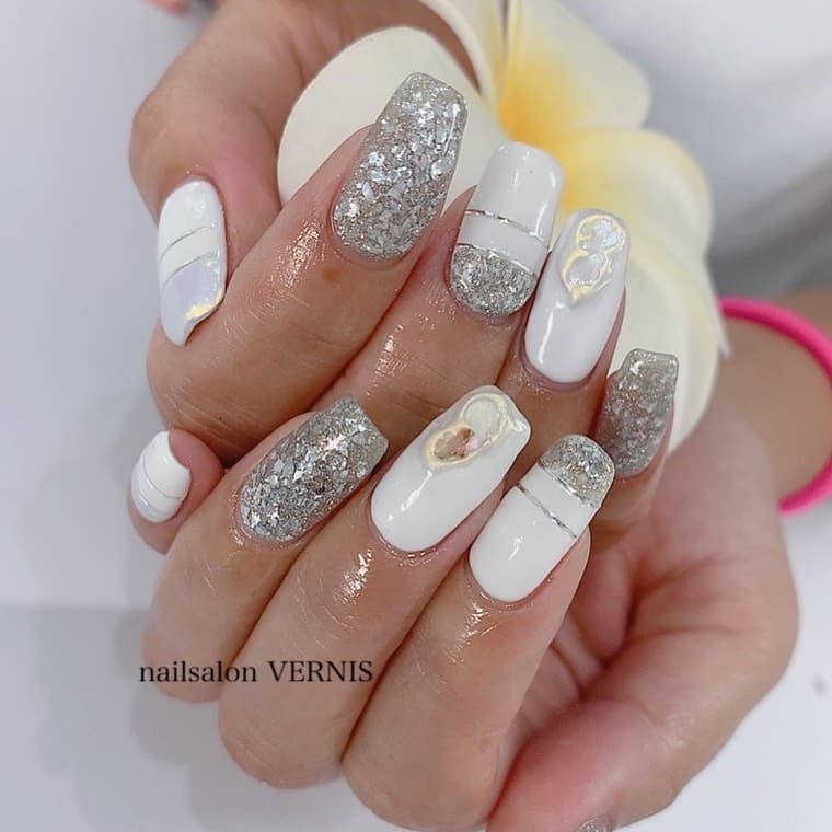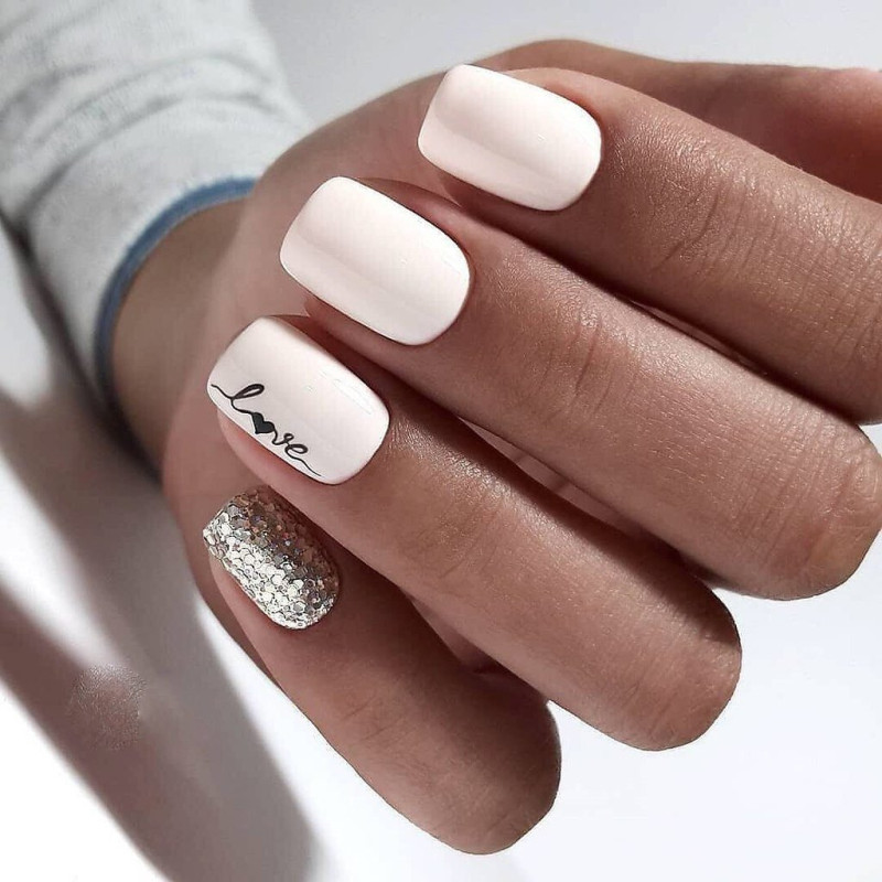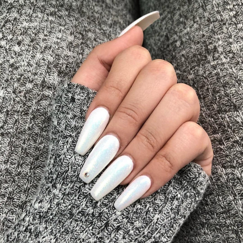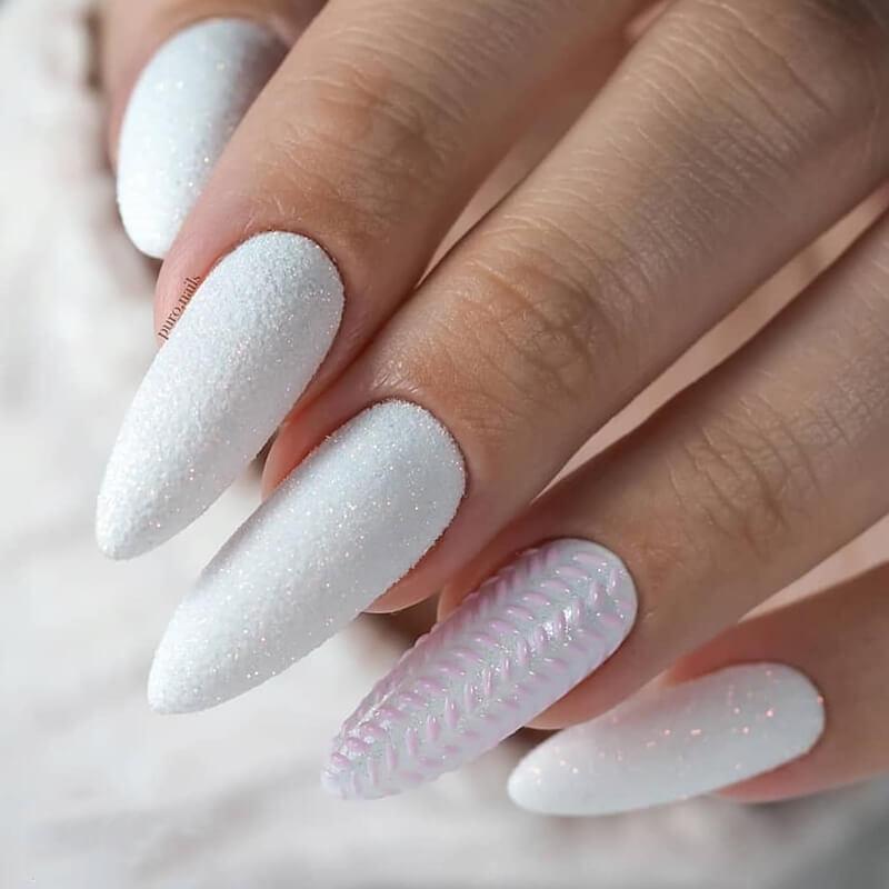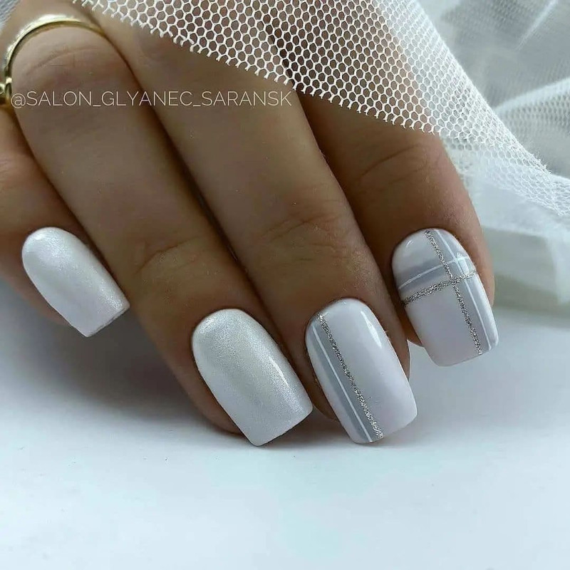 Если посмотреть на фото белого маникюра 2022 года, можно заметить, что все более популярным становится нейл-арт с втирками. Блеск, переливы, которые придает этот декоративный материал, эффектно смотрятся на белом фоне. В зависимости от основного тона втирки, получаются разные оттенки белого цвета с переливами, мерцанием.