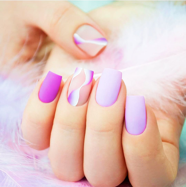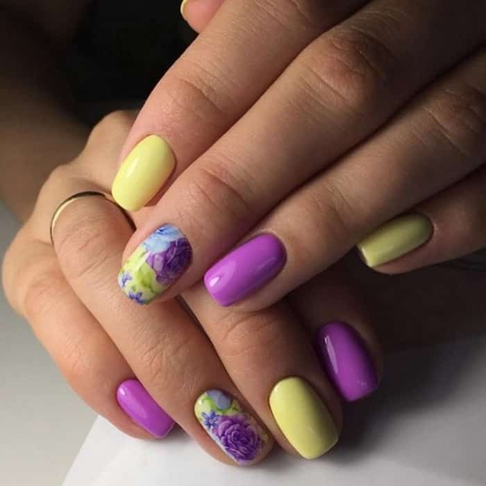 Сделать маникюр ярким и солнечным помогут оранжевые и желтые цвета. Лиловая основа хорошо с ними контрастирует, а сочетая эти оттенки вместе можно получить яркий сочный летний маникюр. При использовании пастельных оттенков и сочетая их в какой-либо технике, нейл-арт получается неброским и аккуратным.