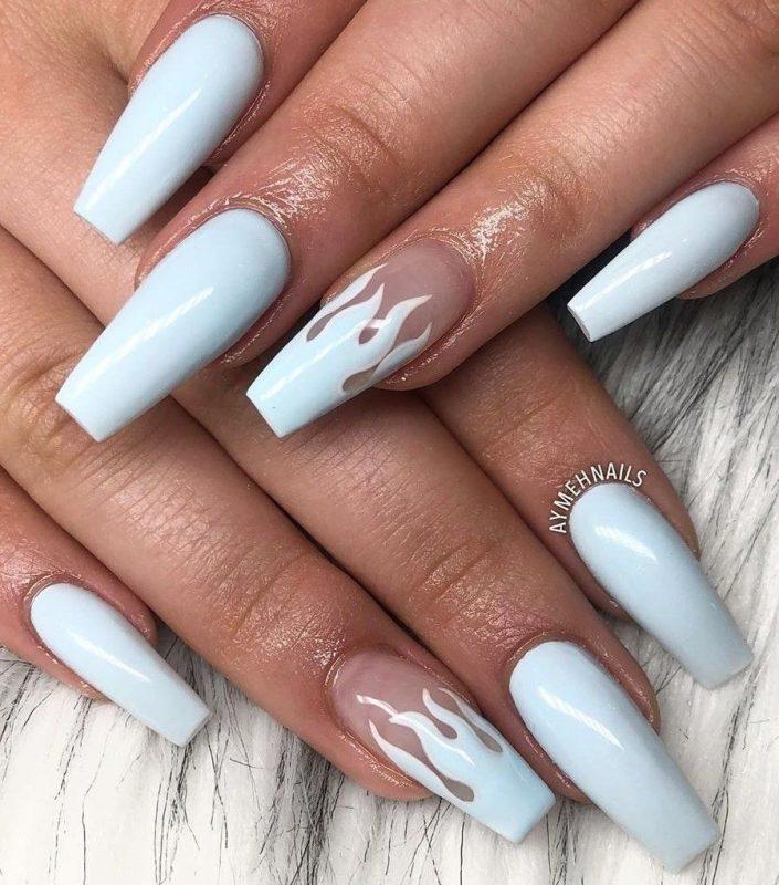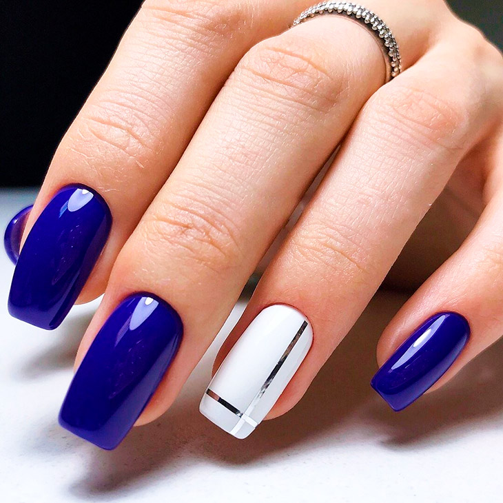 Приглушенные оттенки синего гармонично сочетаются с любым оттенком лилового, яркие тона стоит подбирать аккуратно, чтобы избежать эффекта «забивания» цветов друг другом. Голубые пастельные тона удачно смотрятся с лиловыми оттенками, объединяясь в эффектный геометрический маникюр, френч, точечный дизайн и т.п.