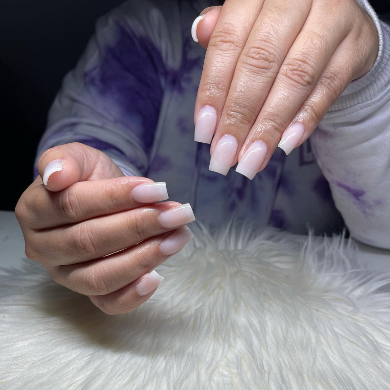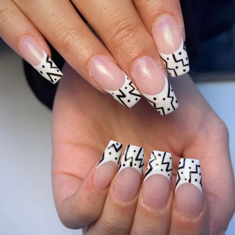 На квадратных кончиках эффектно смотрятся геометрические фигуры. На “квадрате” шикарно смотрится френч. Также можно отдать предпочтение лунному дизайну. Для создания элегантного и мягкого контраста можно выделить зону кутикулы овалом.
