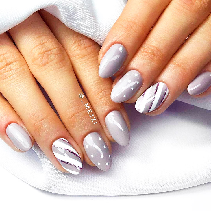 Светлые оттенки сиреневого отлично объединяются с белым цветом в таких техниках: френч, лунный маникюр, лунный френч, геометрия и т.д. Небольшое количество декора (стразы, блесточки, фольгированная лента) добавляют нейл-арту индивидуальности, не отягощая его. Для праздничного или вечернего маникюра можно выбирать более смелые оттенки фиолетового и большее количество декора.