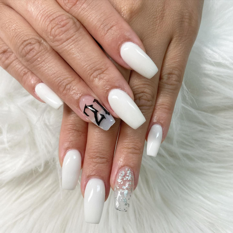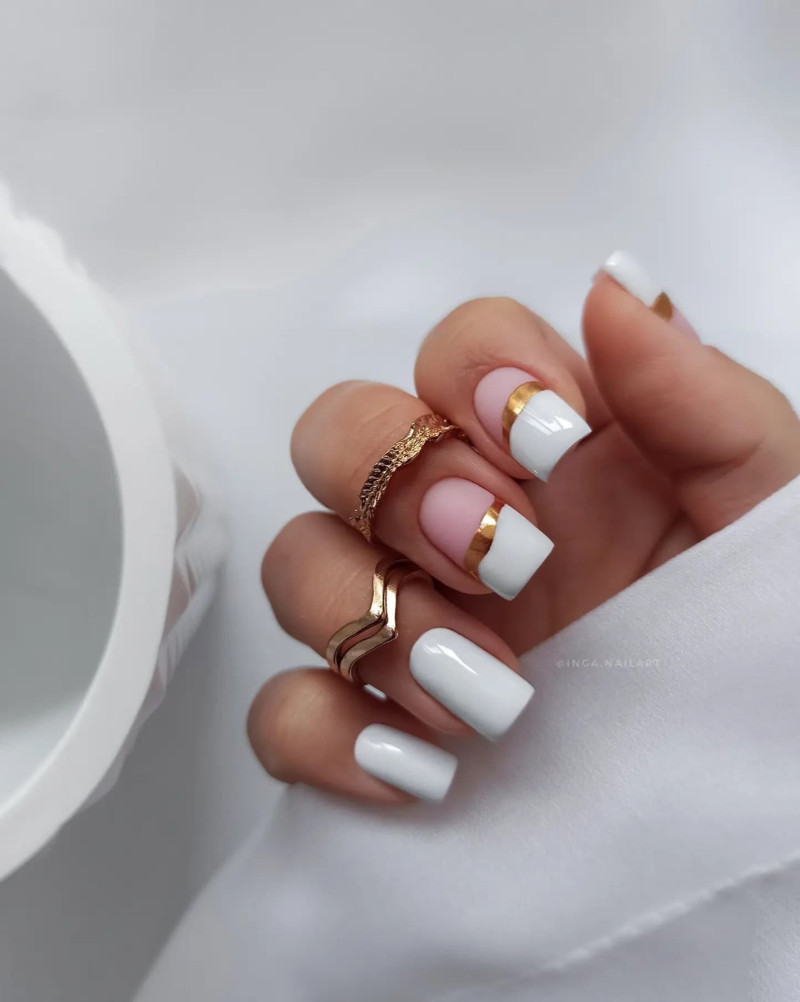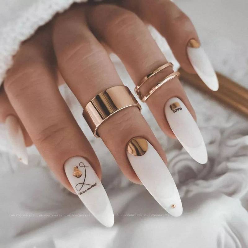 На страницах журналов с фото белого маникюра для 2022 году просматривается модная тенденция — обилие декора из фольги. Существует много видов фольгированного материала для нейл-арта. При помощи трафаретной фольги создают блестящие узоры на белом фоне. Используя другие виды, накладывают разные абстрактные принты с матовыми и глянцевыми текстурами.