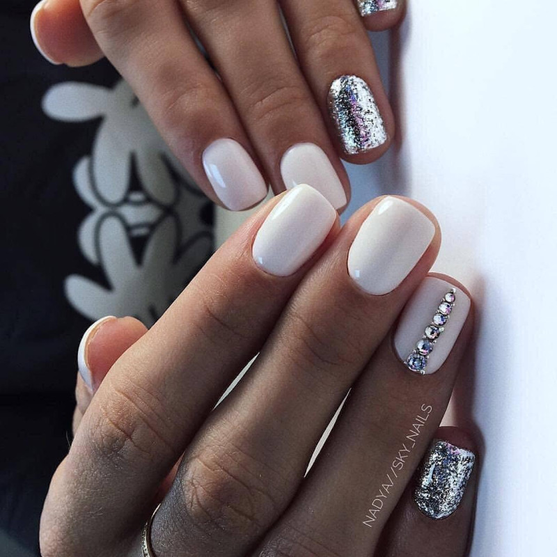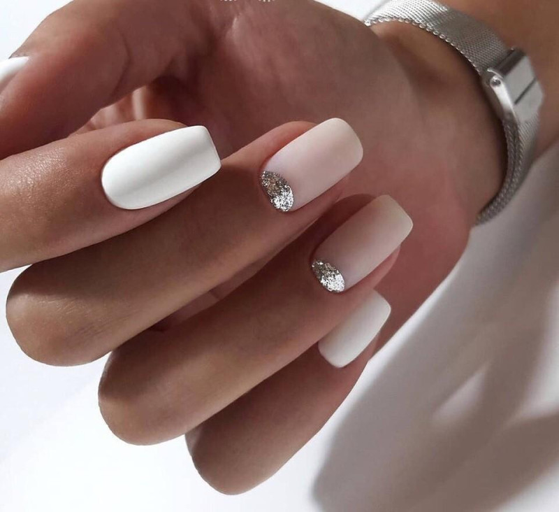 Нежный нюдовый восхитителен в комбинации с густым белым. В основном в такой палитре выполняют френч. Нюдовым красят весь ноготь, добавляют белоснежные прожилки и немного блесток.