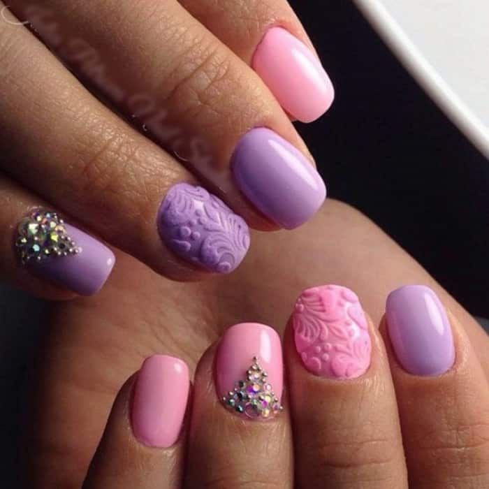 Нежные оттенки сиреневого (лилового) оптимально сочетаются к близким к ним тонам розового. Соответственно насыщенные цвета хорошо сочетаются с такими же яркими вариантами или темными оттенками. Объединятся сиреневый с розовым может в разных техниках маникюра, дополнятся декором аналогичных цветов или яркими элементами под золото, серебро и т.д.