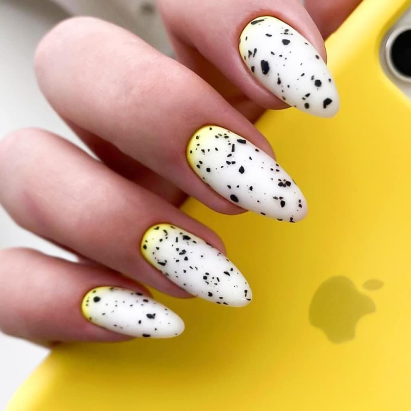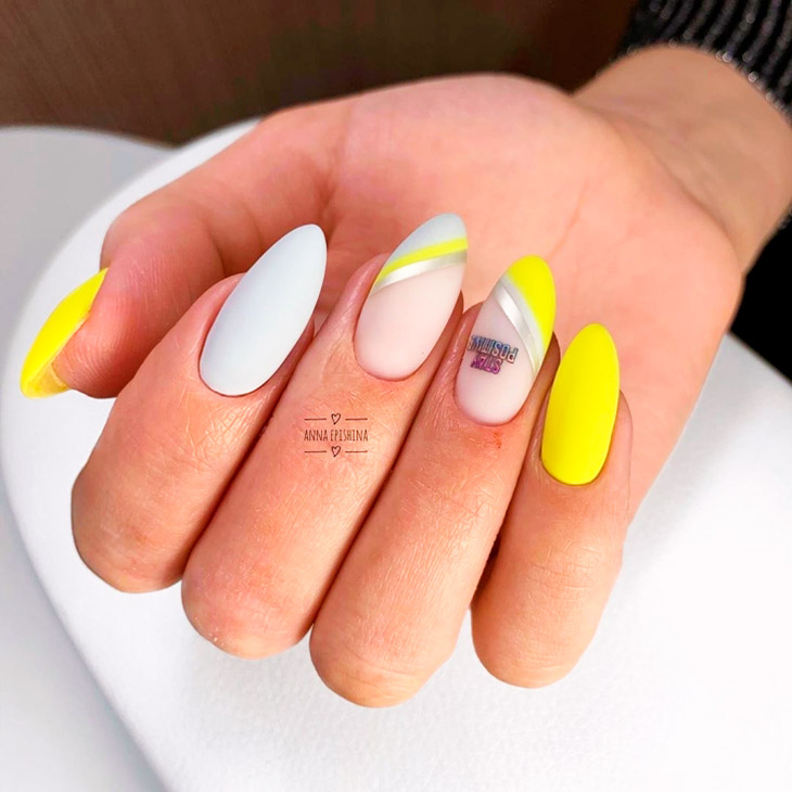 Сочетание теплых белых оттенков с желтым в матовом маникюре — это летнее солнце, свежий воздух и радость. К нему можно добавить тематические рисунки, 3D прозрачные капли, немного яркой фольги.