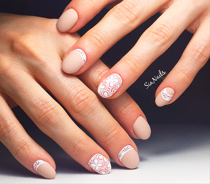 Сочетание нюдовых оттенков в одном дизайне — беспроигрышный вариант. Отлично смотрится нежное почти незаметное омбре, необычный френч с двойной «улыбкой» или простая геометрия. И не забываем о том, что у маникюра обязательно должна быть матовая текстура.