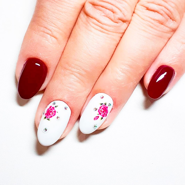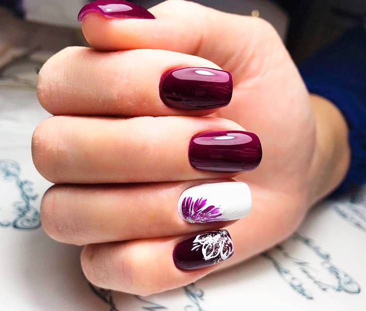 Все оттенки палитры бордо — глубокие, плотные и роскошные. В сочетании с белыми они смогут заиграть новыми красками. Можно добавить золото и серебро для роскоши. Это цветовое сочетание подойдет для коротких ноготков.