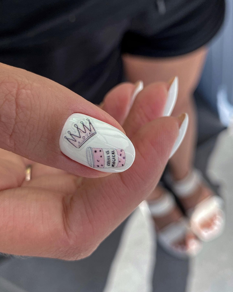 Наклейки можно нанести на ногтевую пластину и дома. Надо только смочить выбранный образец в чуть теплой воде, отделить принт от основы и наложить на ноготь с белой базой. Покрыть топом.