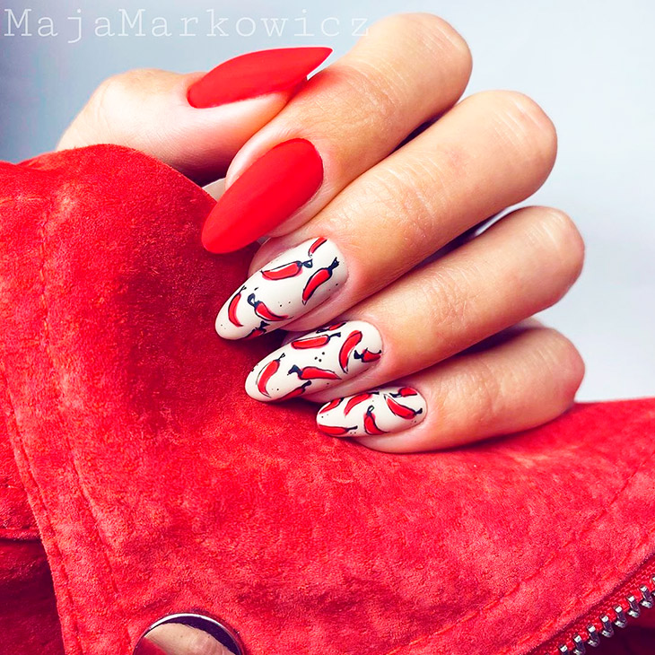 Вариант для дерзких. Подходит для длинных ногтей. Если у вас ультраострые ноготки — белый матовый маникюр с красным дополнением то, что нужно!