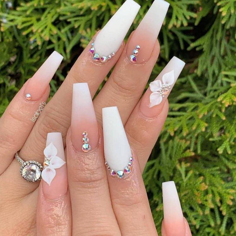 Матовый гель-лак сейчас в моде, его бархатная текстура прекрасно сочетается с декором. Со стразами маникюр приобретает нотки торжественности. Аристократично выглядит нейл-арт с золотым, серебряным литьем. Мягко и нежно смотрится маникюр с флористическими мотивами, объемной лепкой.