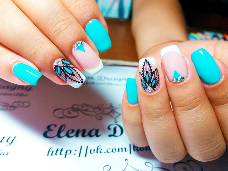 Завораживающая бирюза вместе с сиреневым лаком смотрится очень гармонично и при этом романтично. Модный тандем этих оттенков можно использовать для весеннего, летнего маникюра, декорировать, делать комбинации из матового и глянцевого покрытия. Делая нейл-арт с бирюзовым и лиловым оттенком, стоит учитывать соотношение тона. К примеру, не стоит делать дизайн с ярким сиреневым оттенком и нежным пастельным бирюзовым, а лучше подобрать более насыщенный вариант бирюзы.