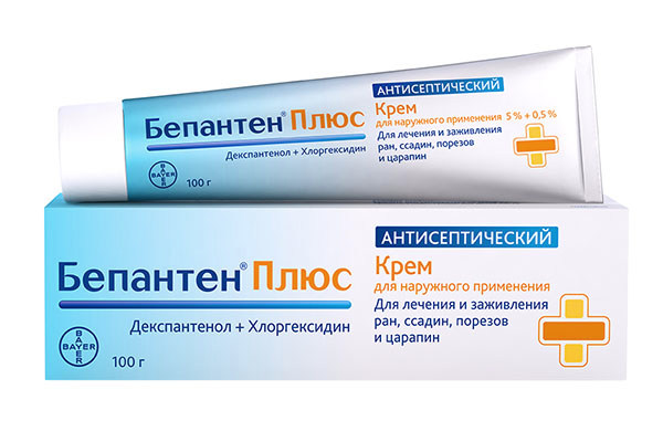 - при возникновении риска проникновения инфекции в незначительные раны и другие повреждения кожного покрова, используется лосьон и крем Бепантен плюс, в составе которых есть хлоргекидина гидрохлорид;