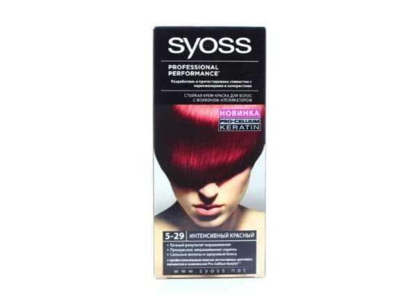 Базовая коллекция бренда содержит четыре красных оттенка. Долговечность результата обеспечивается глубоким проникновением концентрированных пигментов, так что состав подходит даже для обработки седины. Краска для волос Syoss со своей палитрой нравится многим девушкам.