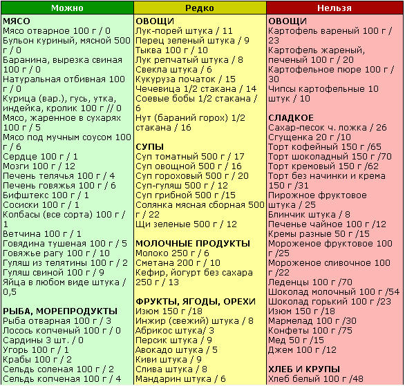 Таблица разрешенных и запрещенных продуктов
