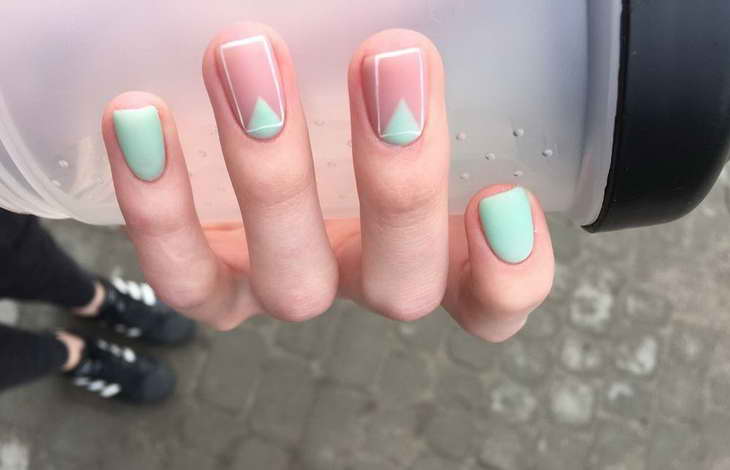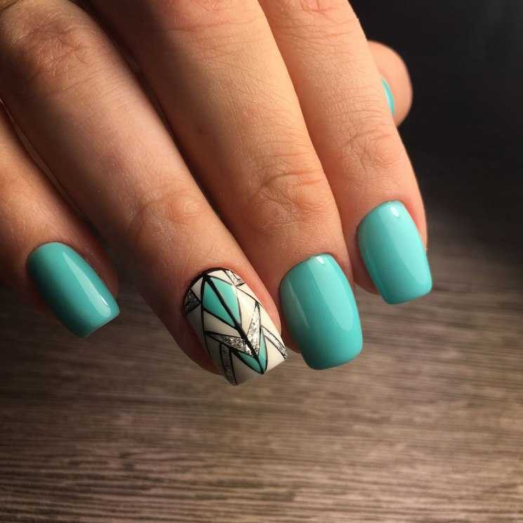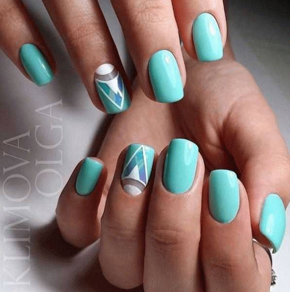 Если добавить маленький рисунок, то маникюр будет выглядеть сдержанным и элегантным. Бирюза будет хорошо сочетаться с геометрическими рисунками.