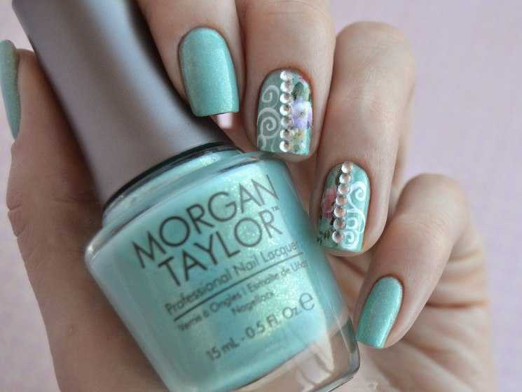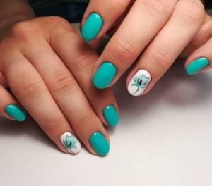 Дополнение однотонного бирюзового маникюра рисунком также будет смотреться очень достойно. Например, красивые цветы подойдут, когда нужен более яркий вариант.