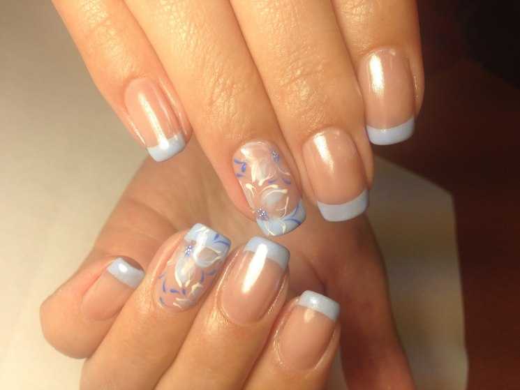 Довершается этот вариант тем, что на четырех пальцах наносится френч бирюзового и белого цвета. Лучше всего делать френч на коротких ногтях.