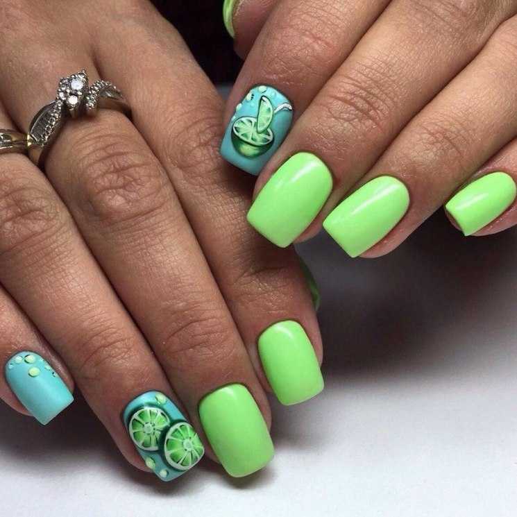 Существует несколько вариантов дизайна, которые возможно выполнить только с помощью полимеров (в частности, пигментированных и прозрачных гелей). Если же говорить о бирюзовом оформлении, прежде всего стоит выделить: