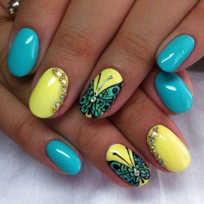 Сперва следует разобраться с тем, какие инструменты и материалы понадобятся для желтого с бирюзовым дизайна ногтей. Это: