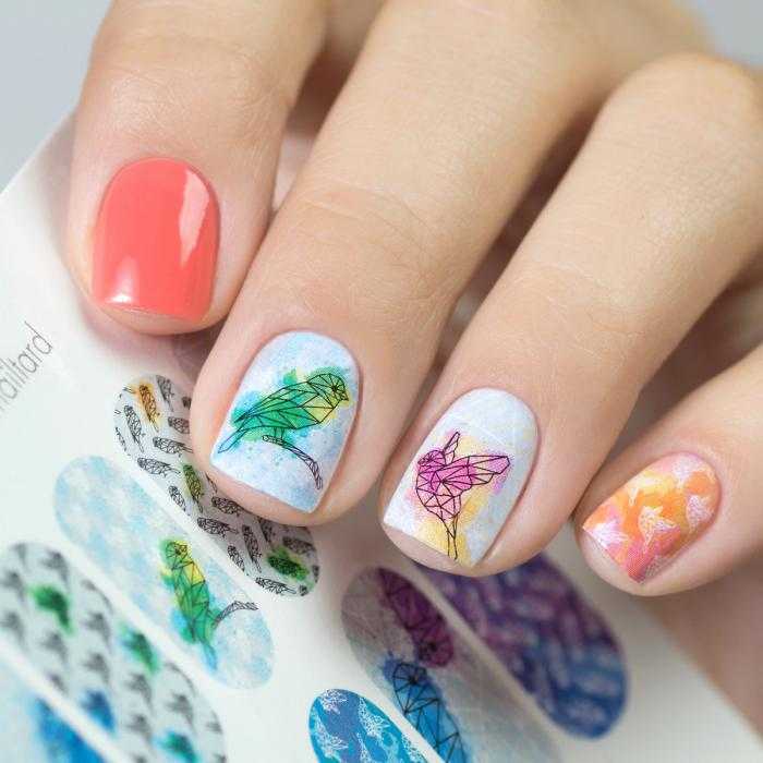 Ну, как же не сделать простой, красивый и модный маникюр с ярким рисунком, когда на полках магазинов лежит такое разнообразие слайдеров. Слайдеры не грех использовать не только новичкам, но и опытным мастерам. Ведь использование наклеек, еще не означает, что вы не умеете рисовать. Просто слайдеры — это отличный вариант экономии времени. К тому же слайдеры перкрасно ложатся на короткие ногти, а вот рисовать на очень коротких ногтях сложно.