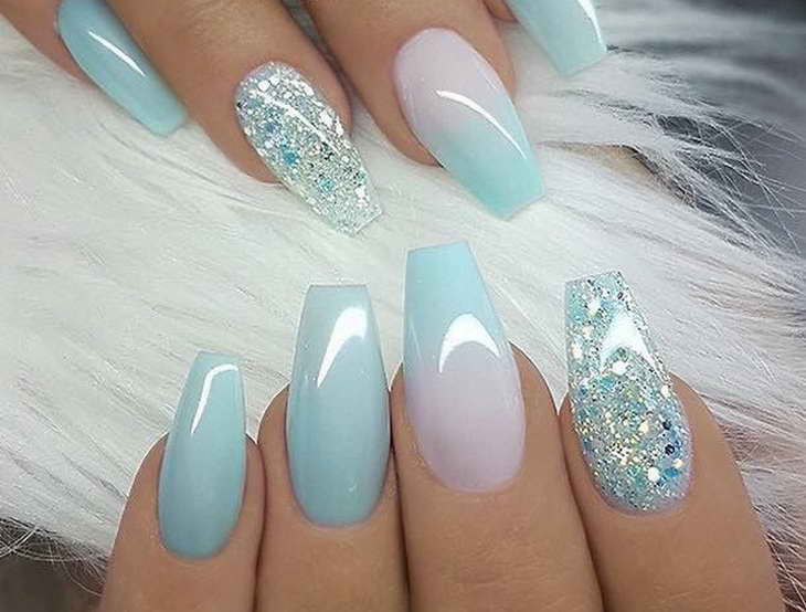 Бирюзовый маникюр с блестками — одно из классических решений. Блестки предадут маникюру фееричности, с ними заиграют новыми красками даже самые простые ногти. Блестки в виде пайеток, похожие на конфитюр, не позволят перегрузить образ.