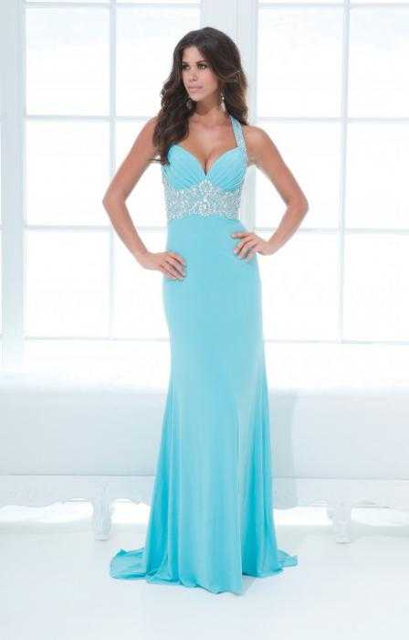 Топазно-голубое платье. Этот цвет считается спортивным, но длинное бирюзовое платье с таким оттенком не будет лишено нежности. Естественно, такое одеяние неуместно в повседневной жизни, но удачно поддержит дресс-код любой вечеринки. Прекрасное сочетание создадут яркие украшения насыщенных цветов.