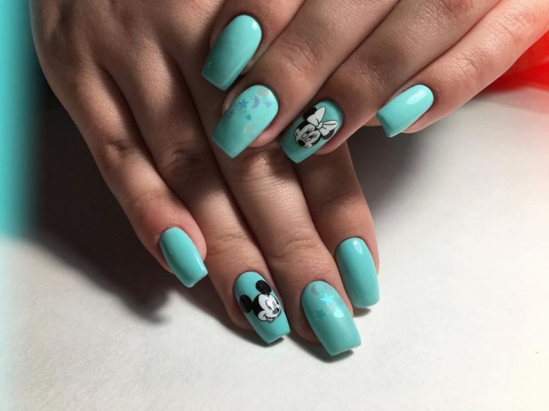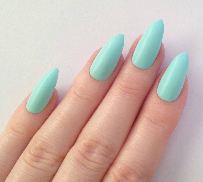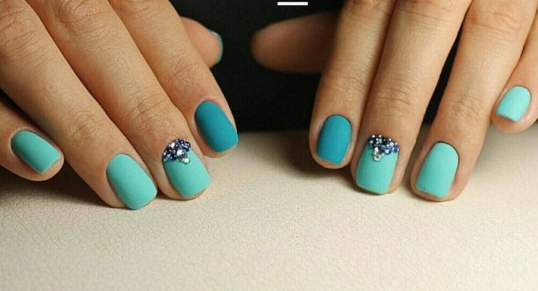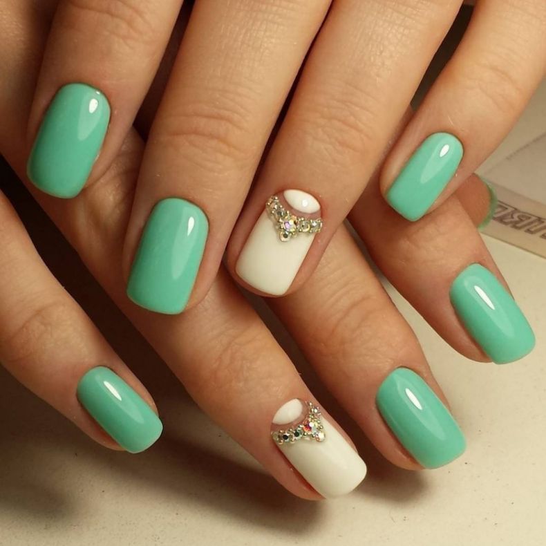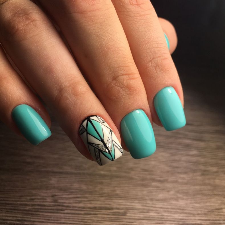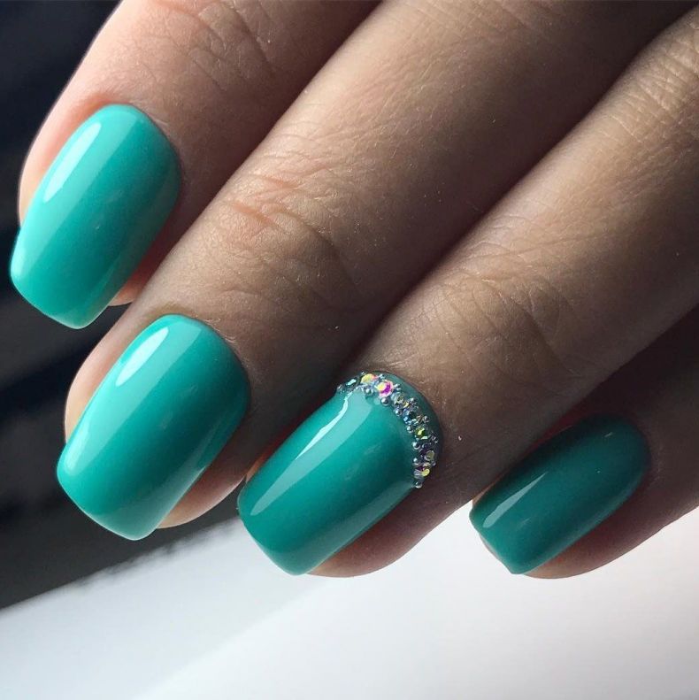 Оттенки могут быть разные, но главное преимущество однотонного покрытия — выглядит аккуратно, ярко и стильно, не перегружен деталями. Причем этот цвет подойдет к длинным и коротким ногтям, напоминает морскую воду и самоцвет под названием «Бирюза». Холодный, но благородный бирюзовый цвет лака сочетает в себе нежно-голубой, белый и светло-зеленый оттенки.