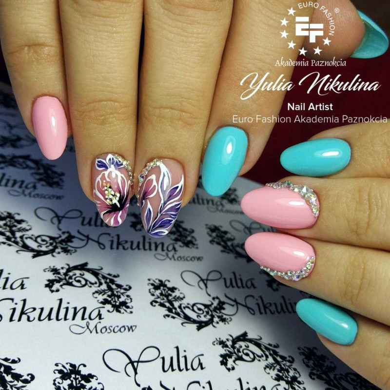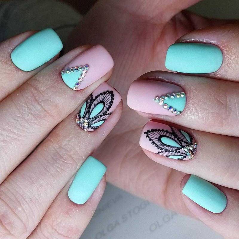 В основном в таком маникюре сочетают бирюзовый цвет с черным. Но также применяют и розовый цвет.