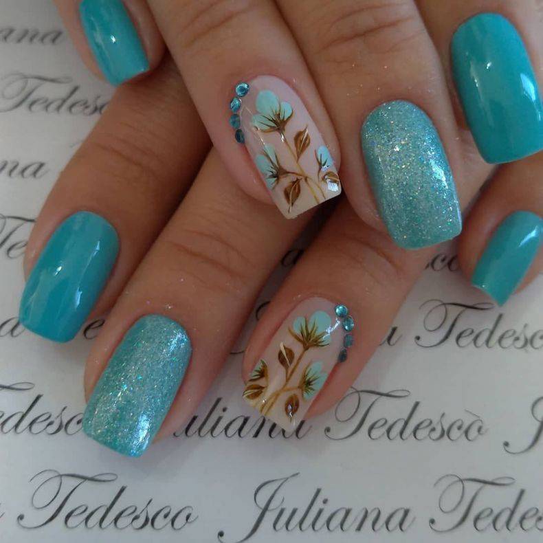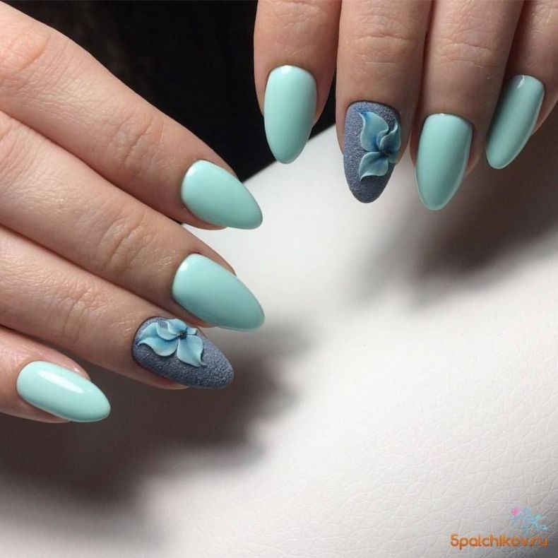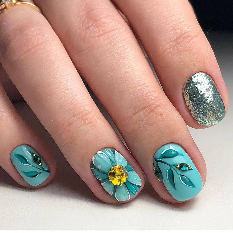 К маникюру бирюзового цвета хорошо подходят цветы.