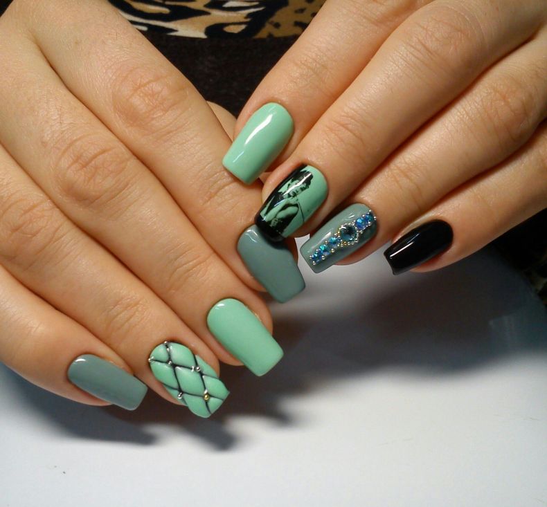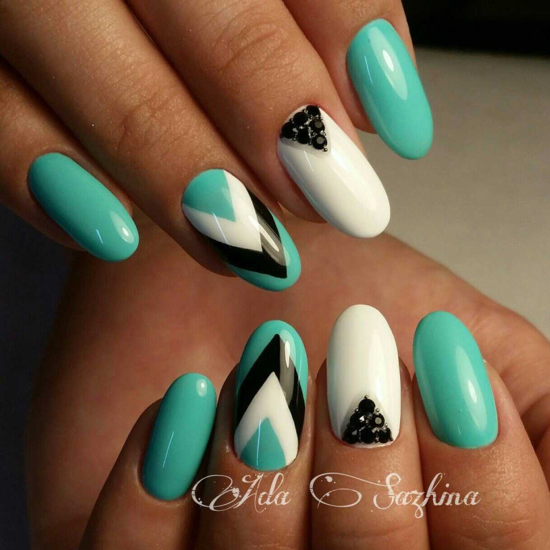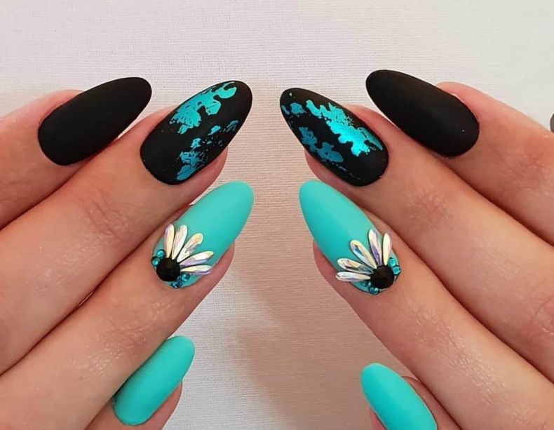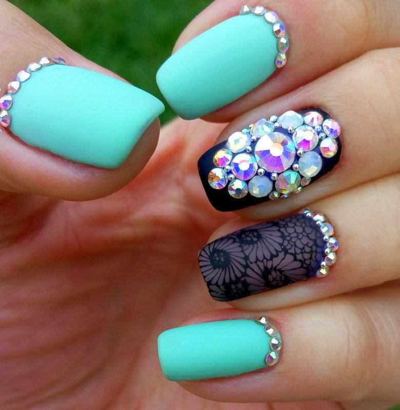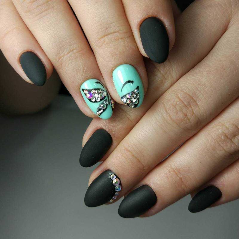 Можно использовать стразы черного цвета на маникюре бирюзового цвета.